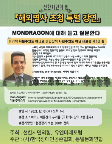 시민단체 <선한시민의힘> (상임대표 이경태 박사)과 유엔미래포럼(대표 박영숙)이 공동주최하여 세계의 협동조합을 선도하는 스페인 '몬드라곤 (Mondragon)' 협동조합의 수석 미래전략이사 이본 주가스티 씨를 초청해 오는 12월 1일(수)오후 7시 여의도 이룸센터 누리홀(국회의사당역 4번출구)에서 특별강연(특별찬조 : 유엔 미래포험 한국대표 박영숙 교수)을 개최한다.